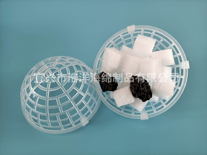 將我公司特殊工藝生產(chǎn)的聚氨酯海綿作為培菌載體。填充在 PP / PE 材質(zhì)制作的懸浮球中,由于該生物載體的多孔網(wǎng)狀特殊結構,提高了生物培養載體的比表面積。突破點(diǎn)是在曝氣池內單個(gè)生物載體的外表面實(shí)現亞硝化反應,在內部實(shí)現亞硝酸鹽的反硝化,其中不僅有簡(jiǎn)單的物理吸附,還有正、負電荷的引力。使載體表面帶有一定的陽(yáng)離子活性基團及經(jīng)基等親水性基團,可與污水中帶有負電荷的微生物產(chǎn)生鍵、價(jià)的固定結合,從而將微生物及生物酶牢固的固定在載體上。使成活后的微生物不容易在水、氣的剪切作用下流失。微生物的負載量大,容積負荷高,從而使污水中的氨氮、總氮達到同時(shí)下降的目的。它同時(shí)還具有切割氣泡能力強,空間體積利用率大、無(wú)死區等優(yōu)點(diǎn)。是當前生物處理技術(shù)中微生物載體理想的產(chǎn)品。